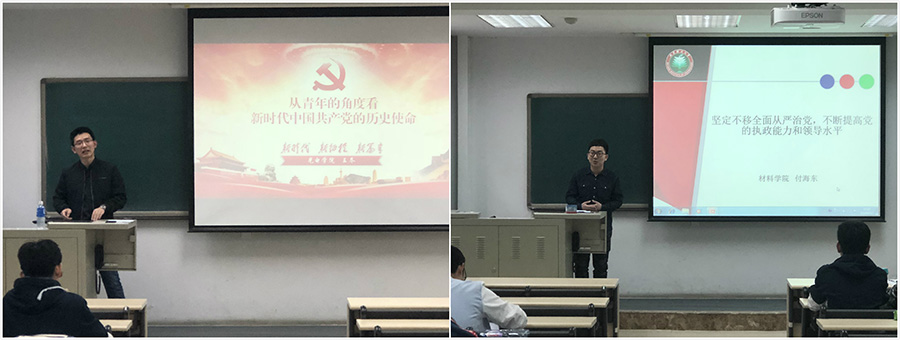 本次研修班邀请到光电学院王冬老师和材料学院付海东老师分别以《从青年的角度看中国共产党的历史使命》和《坚定不移全面从严治党,不断提高党的执政能力和领导水平》为主题,为学员们上了两堂意义深刻的专题辅导课。两位老师从不同的角度并结合十九大精神,为学员们讲述了党在新时代下的历史使命以及当下党所面临的的诸多考验,不但提高了学员们的理论知识水平,而且更加提高了学员们对党的认识,端正了自己的入党动机。