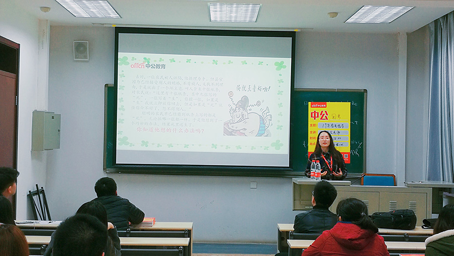为加强学院学生对公务员考试的了解,提升考试能力,国际教育学院团委于3月22日晚18:00在继续教育楼125教室举办了就业指导系列讲座之公务员考试专场,为备考公务员的学生提供认知平台。本次讲座邀请了来自北京中公教育的李素丽老师,为我院40余名同学讲述备考公务员之路。